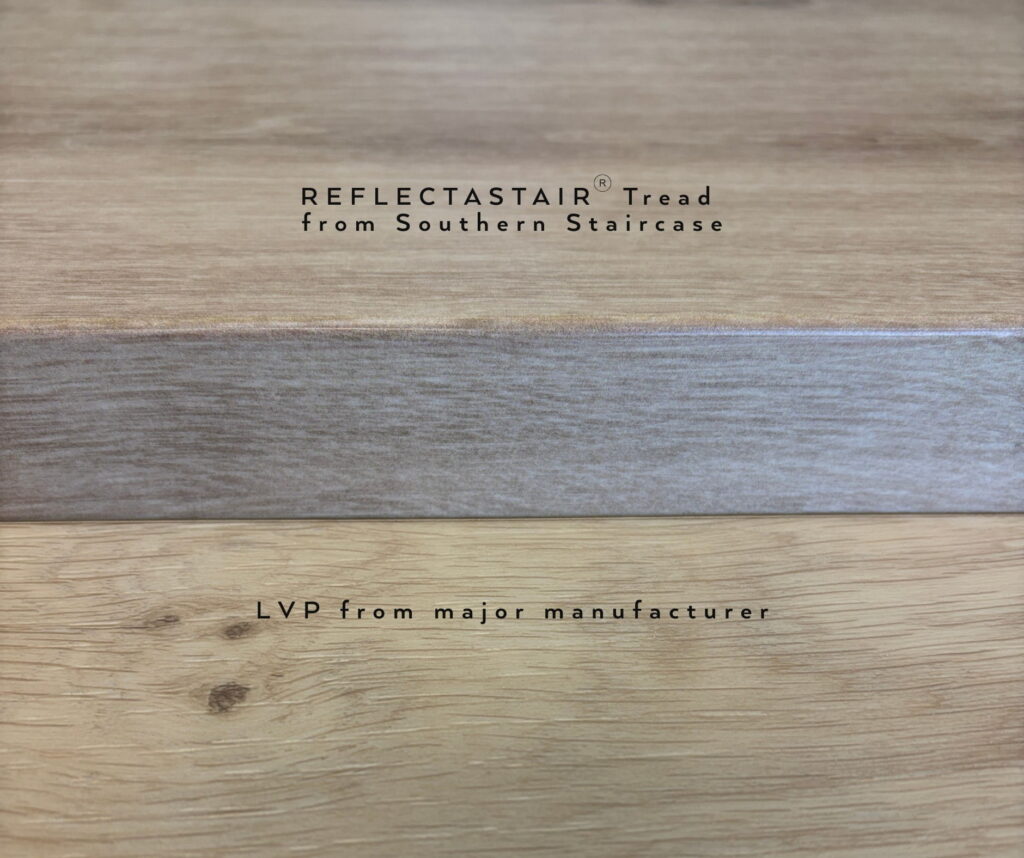 A: ReflectaStair® is a proprietary prefinished stair tread system developed by Southern Staircase that allows luxury vinyl plank flooring to visually continue onto the staircase.